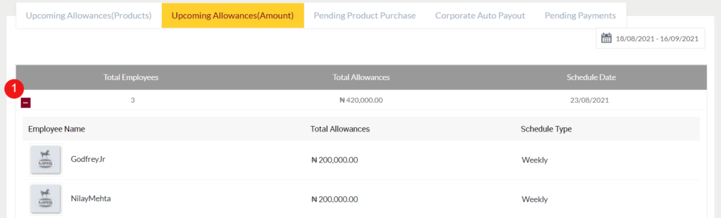 - On clicking the “+” icon, the user will be able to view the list of the employees under the upcoming allowances. The list contains the following.
